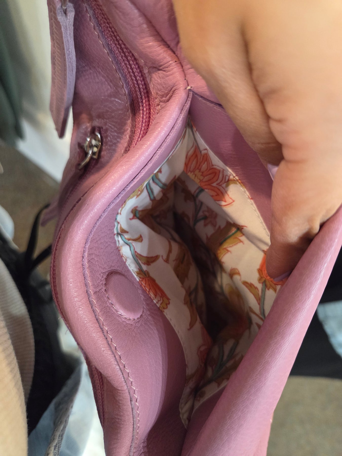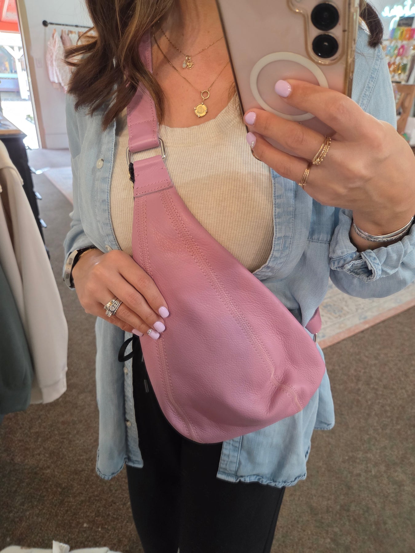 Handcrafted by skilled artisans in South America and India, this small Hippie Bag in lavender features premium full-grain leather that develops a beautiful patina over time. The versatile ergonomic sling adjusts from 43.5" long and wears comfortably on your front, side, or back. Stay organized with 3 zippered compartments, 2 exterior pockets including a hidden phone pocket, and an interior zip pocket. Measuring 14.25"H x 7"L x 3"D and weighing just 0.7 lbs, this minimalist design combines timeless craftsmanship with practical, hands-free functionality.