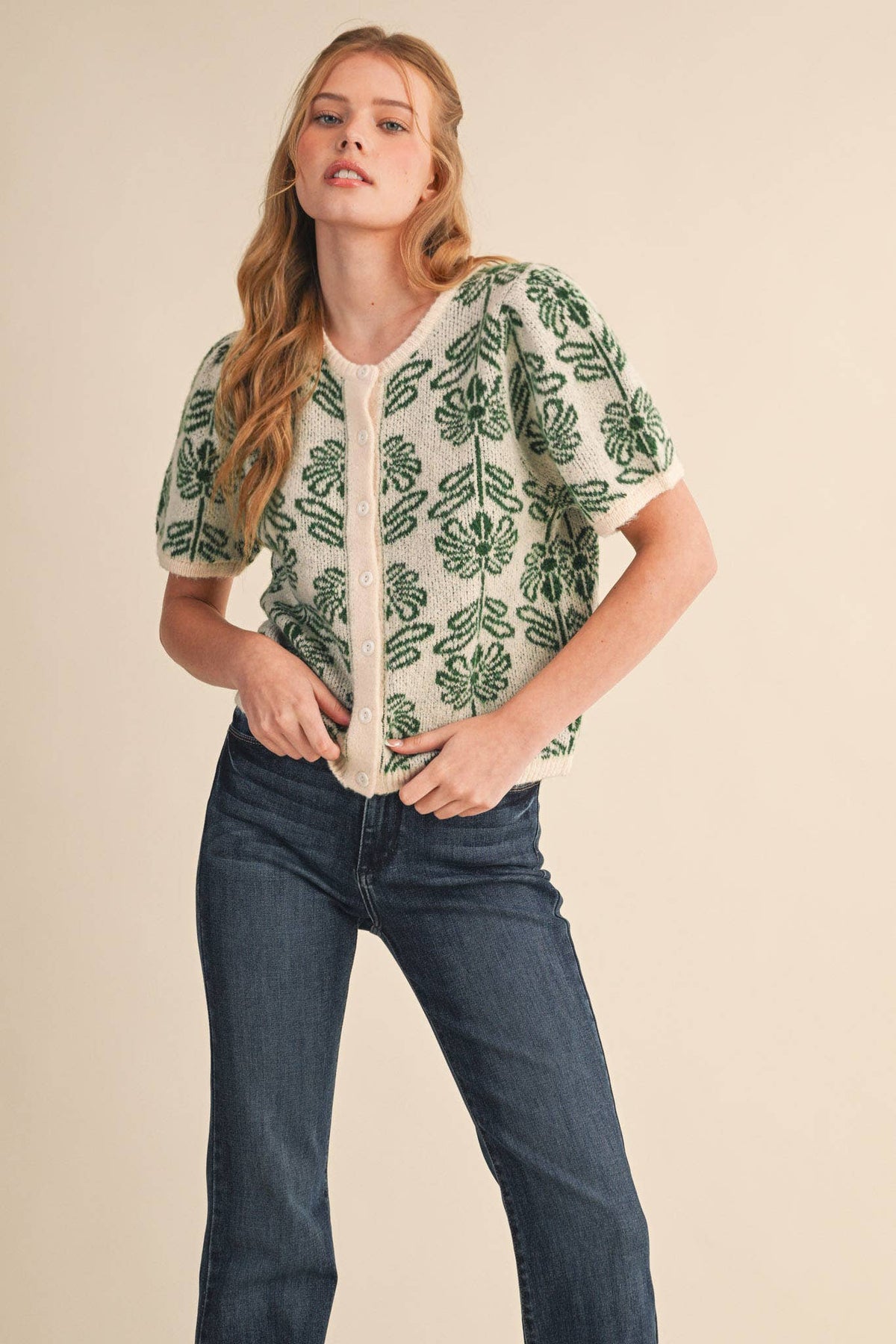 + Floral knit short puff sleeve sweater cardigan + Ribbed round neck + Short puff sleeves + Button down placket + Relaxed fit + Ribbed hem + All-over floral knit design + Model is 5' 7.5" 30-25-36 and wears a S