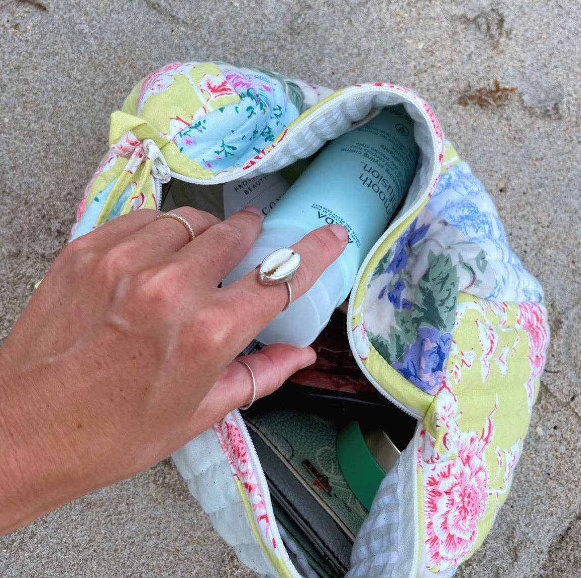 Pouch is soft and compact, in our signature Sadie patchwork, with interior fabric lining and four pockets. Zip closure at top.