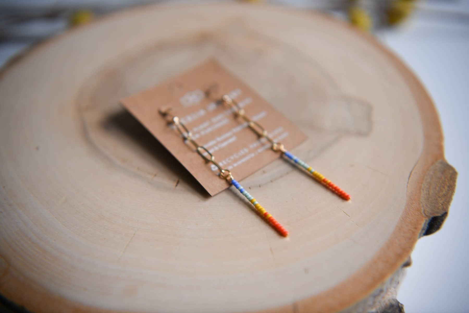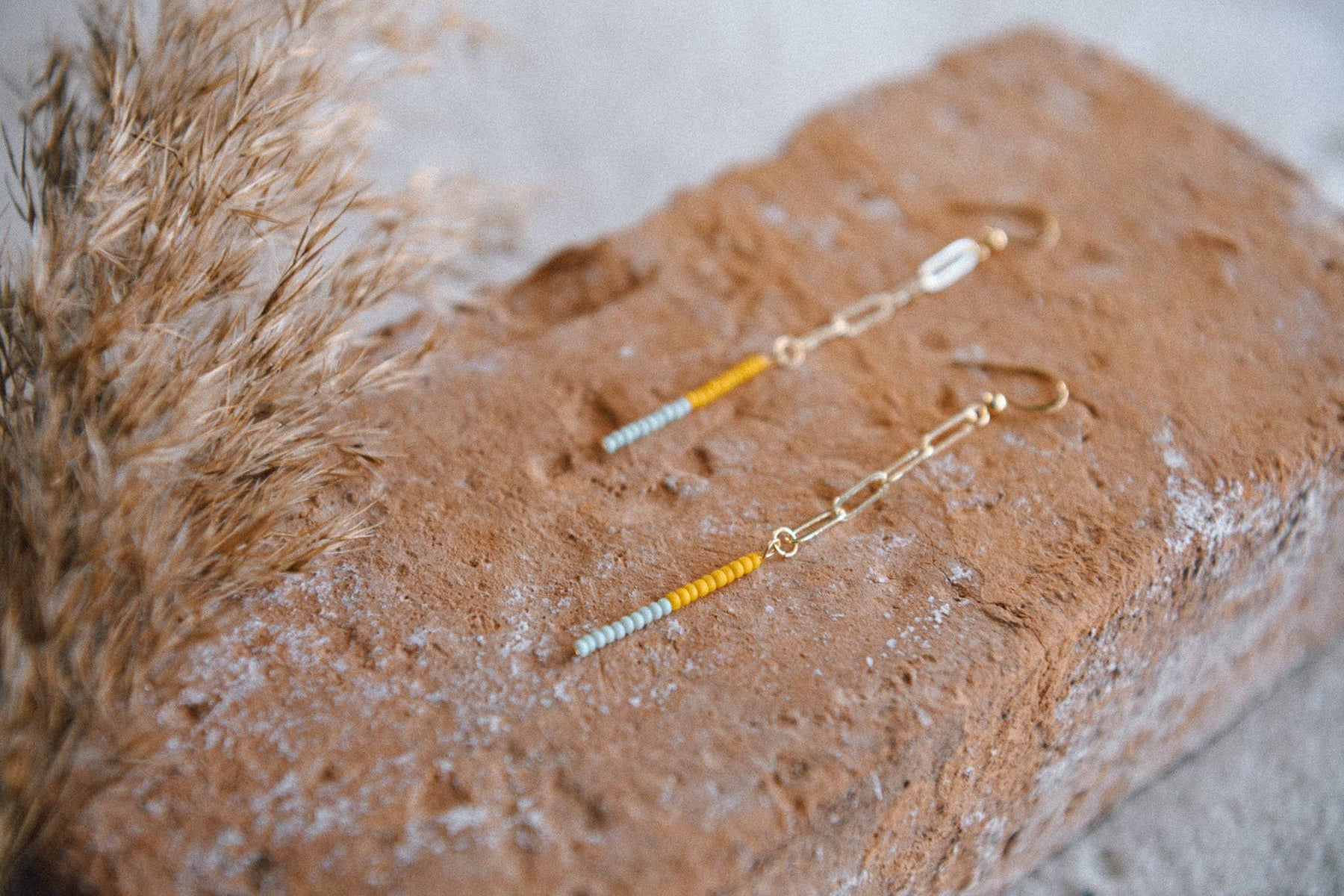 These delicate dangle earrings blend modern elegance with a touch of bohemian charm. Featuring a lightweight gold-plated chain with a sleek, linear seed bead accent, they offer a stylish balance of texture and movement. Designed for effortless wear, these earrings bring a subtle yet eye-catching statement to any outfit.
