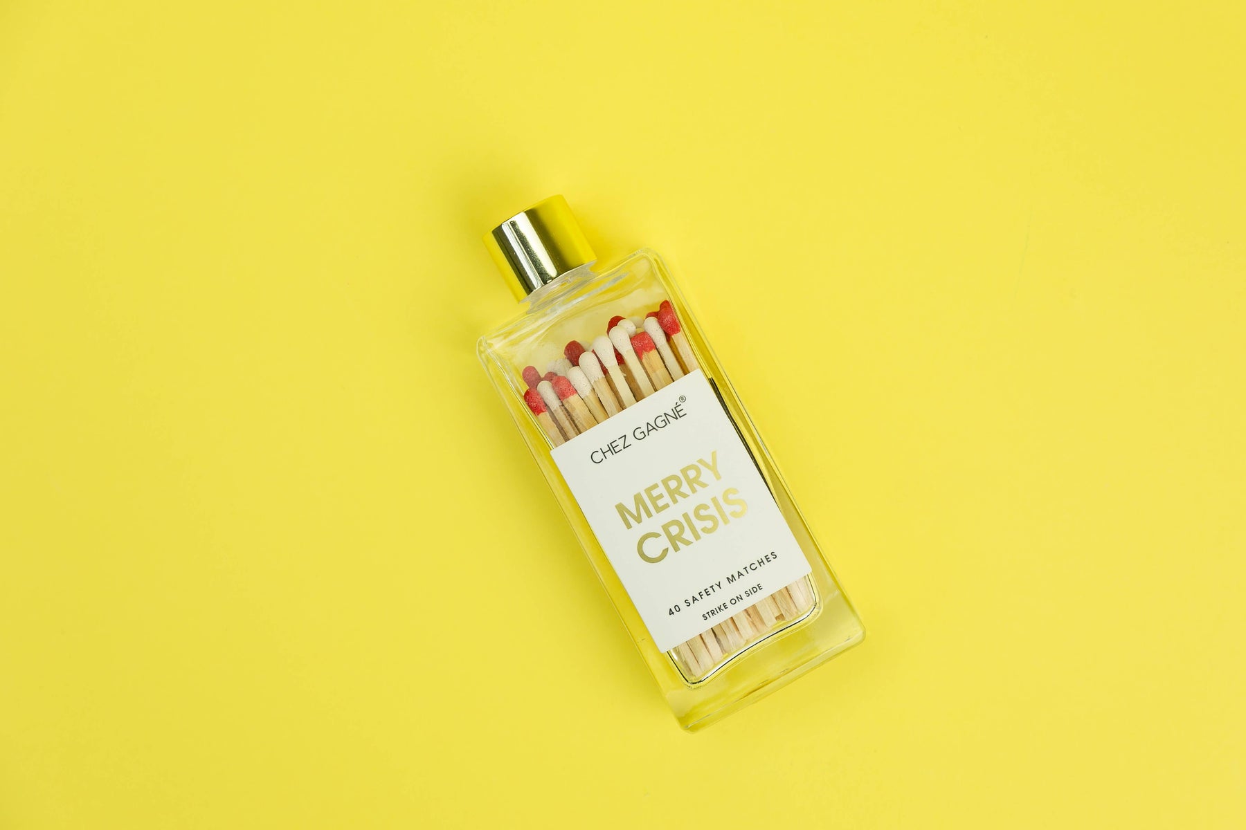 Because nothing says “festive” like lighting a candle while silently screaming into the void. Our Merry Crisis matches bring holiday cheer with a cheeky twist—featuring red + white tips in a sleek glass bottle. Perfect for pairing with candles, cocktails, and coping mechanisms.