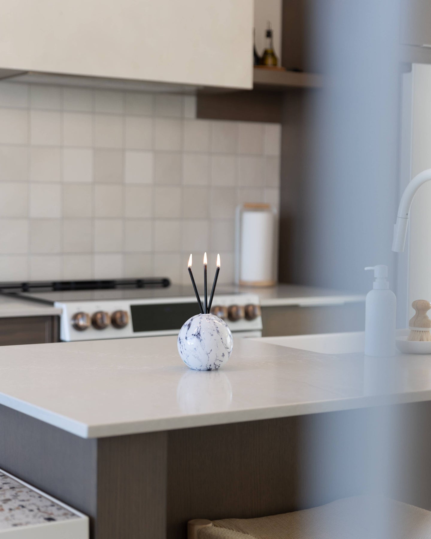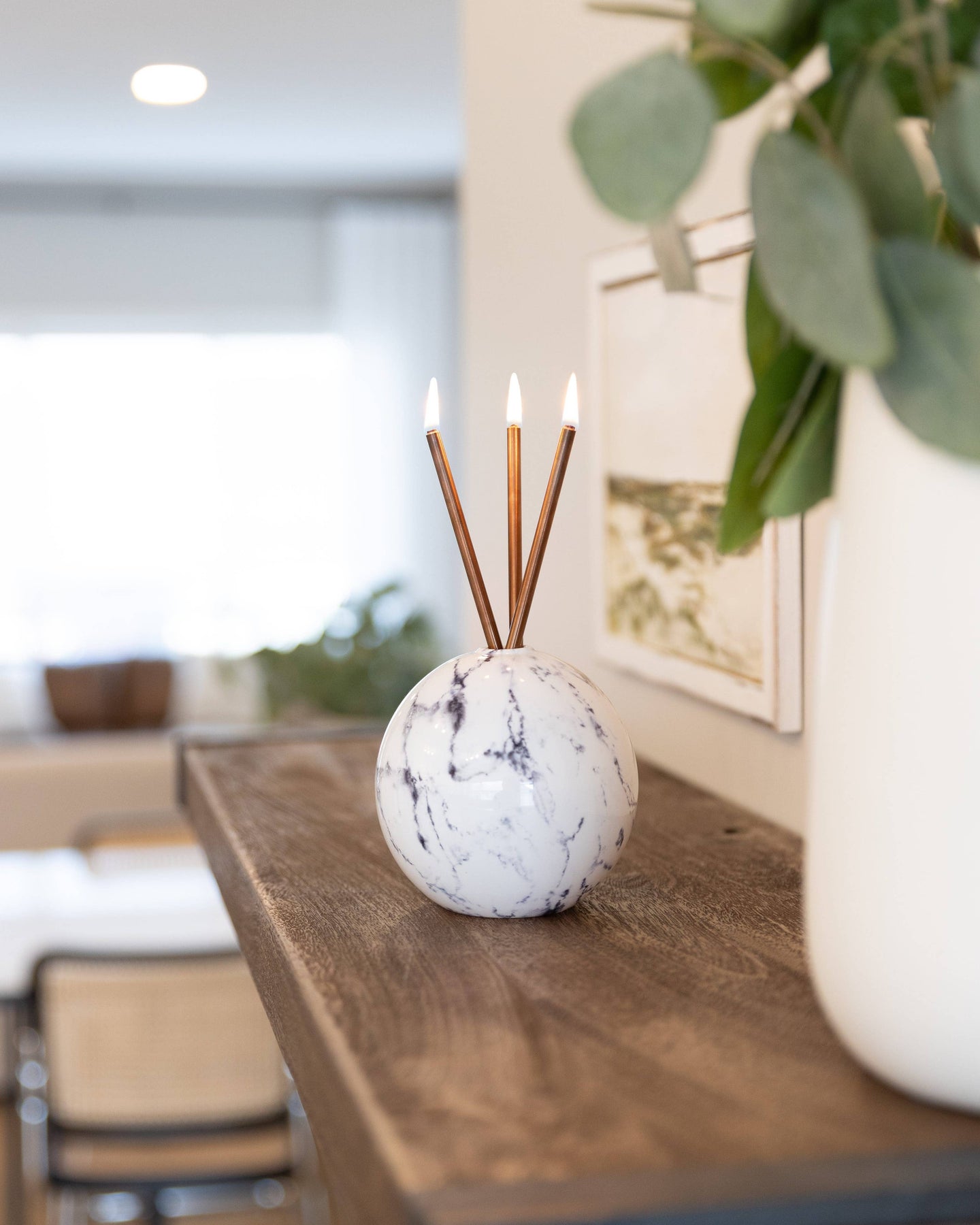 The White Marble Neva embodies an earthy and grounded aesthetic, seamlessly blending nature's beauty with modern style. Its minimalistic yet bold and beautiful presence is a show stopper. Crafted from hand-blown borosilicate glass, this vase is designed to hold Pristine Oil® and Everlasting Candle sticks (both sold separately) to complete the timeless candlelight experience. Why you'll love it: * Sustainable, reusable design resonates with today’s eco-conscious consumers  * A thoughtful gift for any occasion for the person who has everything * Adds timeless ambiance to everyday moments * 100% recyclable packaging How to Use: 1. Fill the vase with Pristine Oil®. 2. Insert Everlasting Candle sticks. 3. Light for elegant, smoke-free candlelight ambiance.